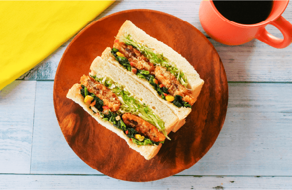 あじフライとバター炒めほうれん草に、キャベツと大葉が爽やかなアクセントになったサンドウィッチです。